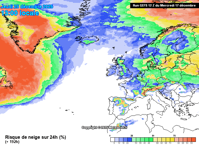 Probabilités de neige pour le jeudi 25 décembre 2025 en tenant compte des différents scénarios - meteociel.fr