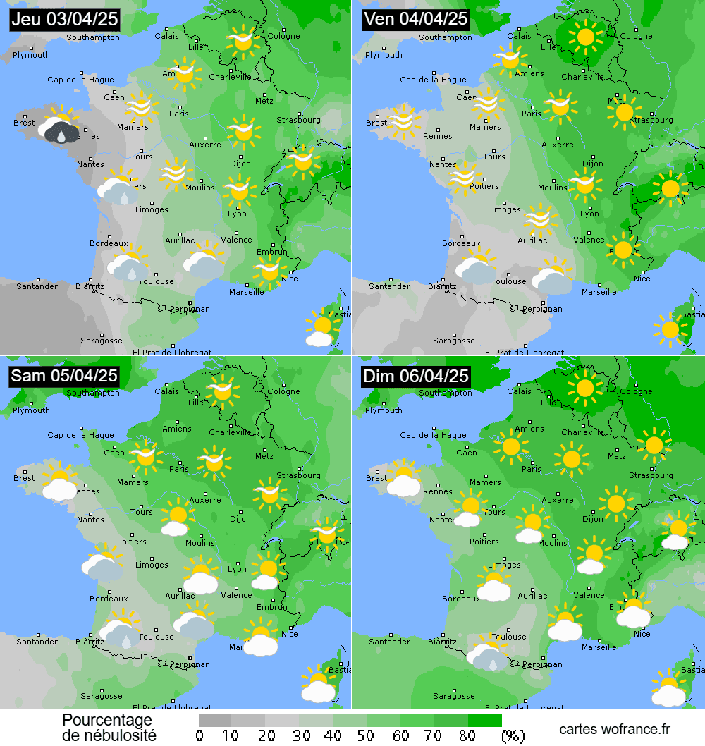 Pourcentage de nébulosité prévu du jeudi 3 au dimanche 6 avril 2025 - wofrance.fr