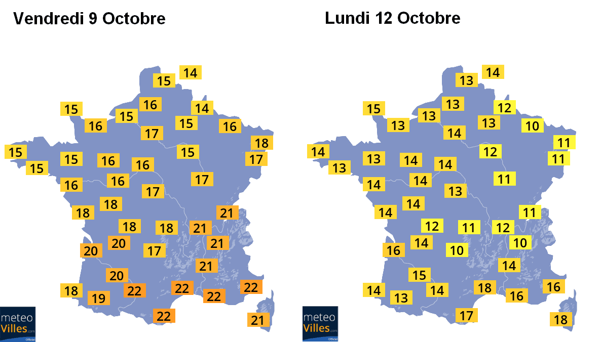 Températures maximales prévues pour le Vendredi 9 et le Lundi 12 Octobre - Météo-Villes