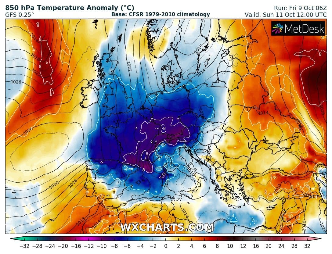 Anomalies de températures à 850hPa sur l'Ouest de l'Europe pour le Dimanche 11 Octobre - Modèle GFS via WX CHARTS