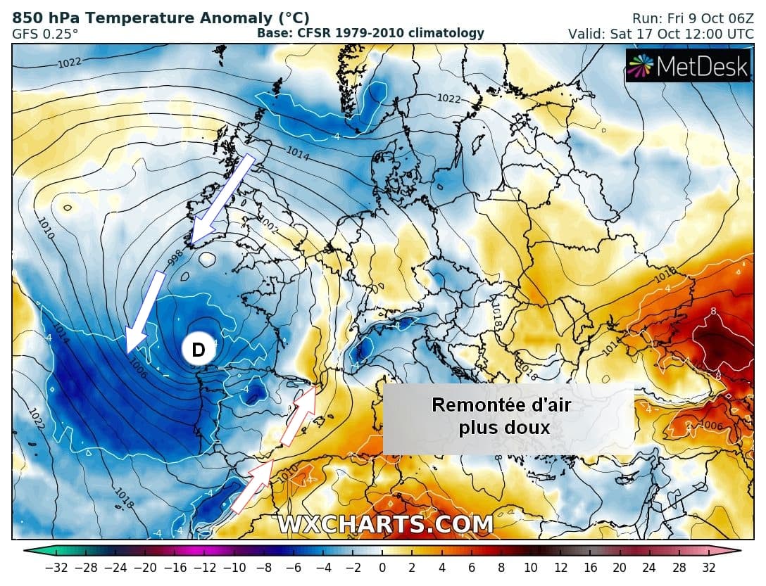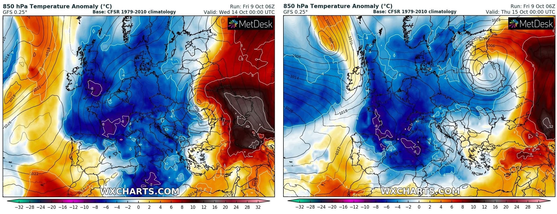 Anomalies de températures à 850 hPa pour le Mercredi 14 et le Jeudi 15 Octobre sur l'Ouest de l'Europe - Modèle GFS via WX CHARTS
