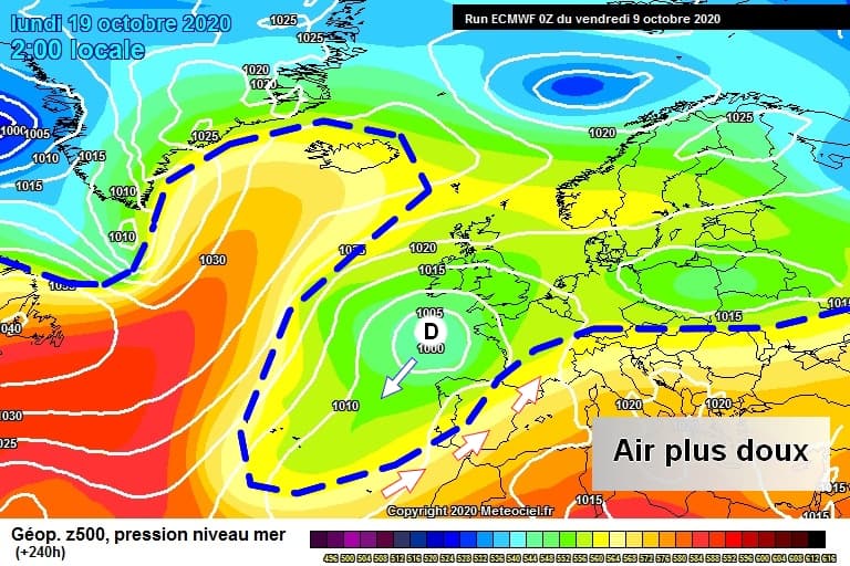 Schéma de la situation atmosphérique envisagée le Lundi 19 Octobre par le modèle ECMWF/CEP - Via météociel.fr