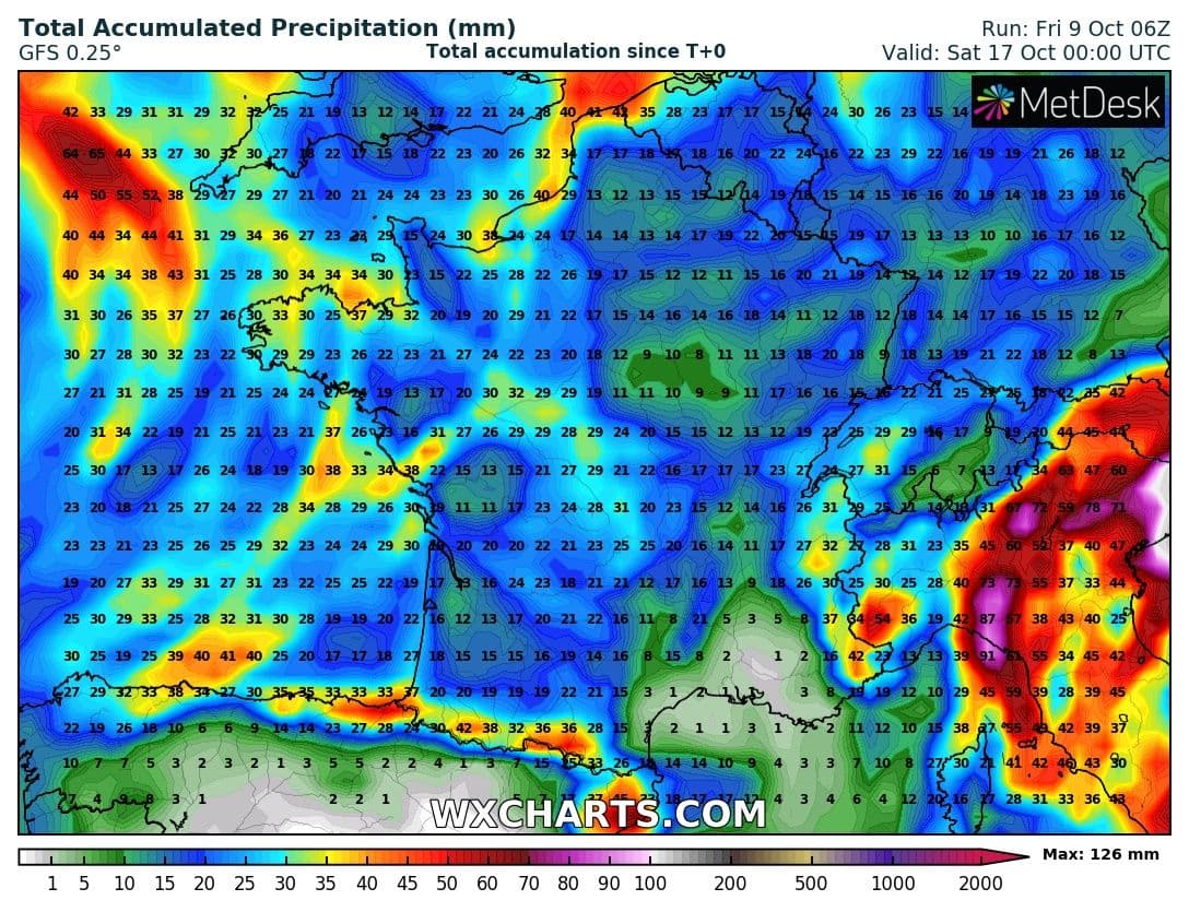 Quantités de précipitations prévues du 9 au 17 Octobre - Modèle GFS via WX CHARTS
