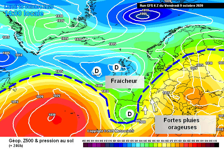 Schéma de la situation atmosphérique envisagée le Lundi 19 Octobre par le modèle GFS - Via météociel.fr