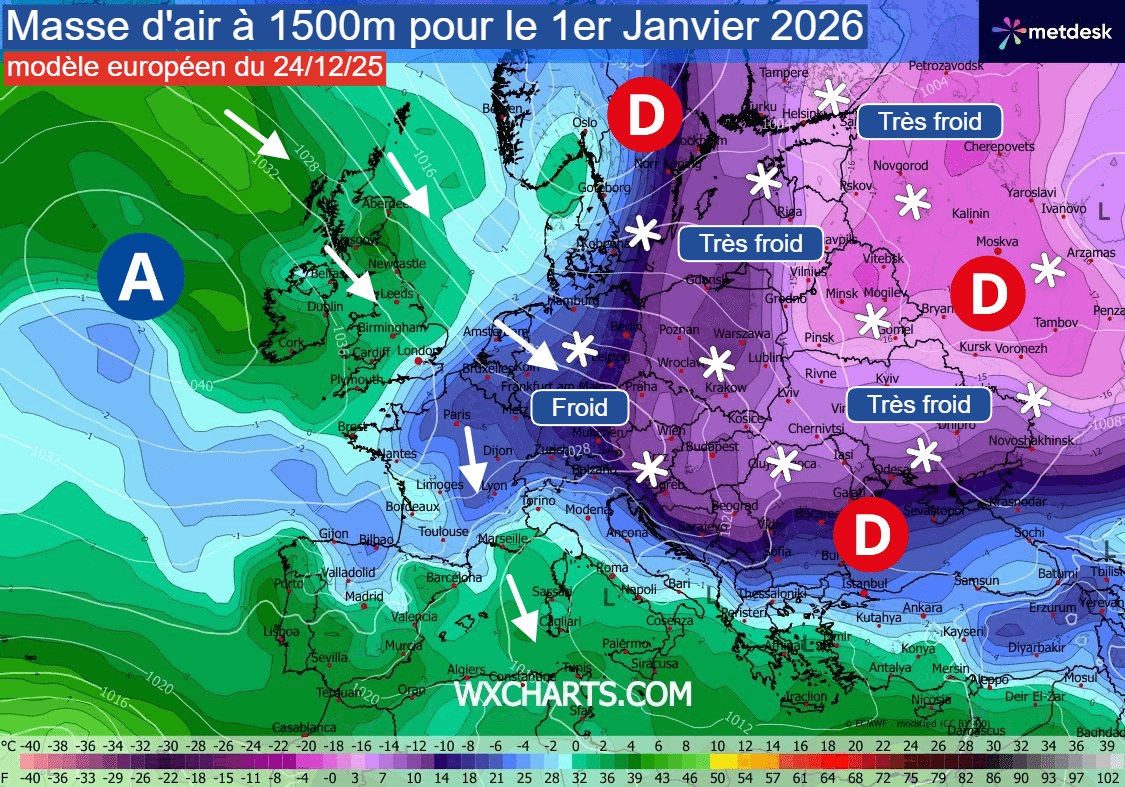Masse d'air à 1500m vue par le modèle européen pour le 1er janvier 2026 - wxcharts.com