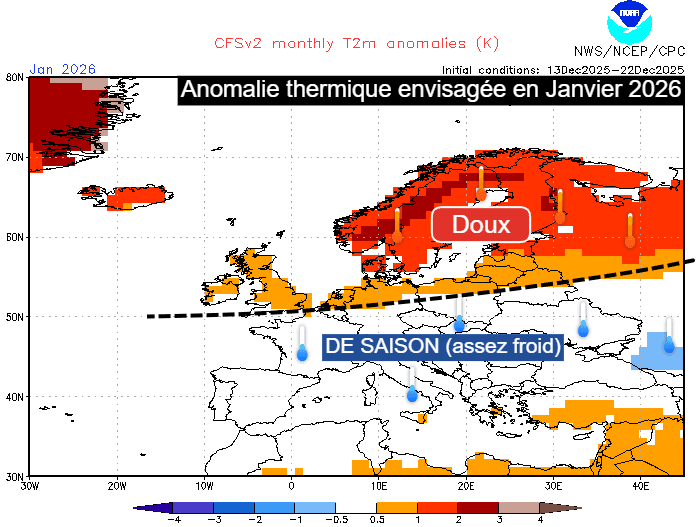 Anomalie thermique envisagée en Europe au mois de janvier 2026 - NOAA