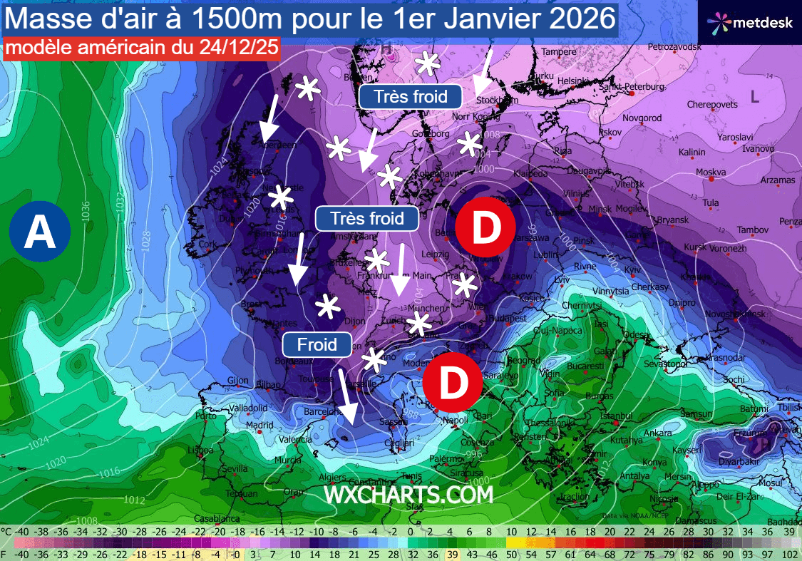 Masse d'air à 1500m vue par le modèle américain pour le 1er janvier 2026 - wxcharts.com