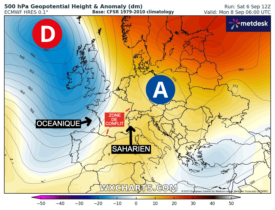 Comme fréquemment observé, les orages qui se produisent sur le territoire français sont liés à une confrontation entre l’air chaud provenant d’Afrique du Nord et l’air océanique plus frais qui cherche à s’imposer. Cependant, cette situation nécessite également la présence d’air froid en altitude et une dépression suffisamment marquée dans les hautes couches de l’atmosphère.