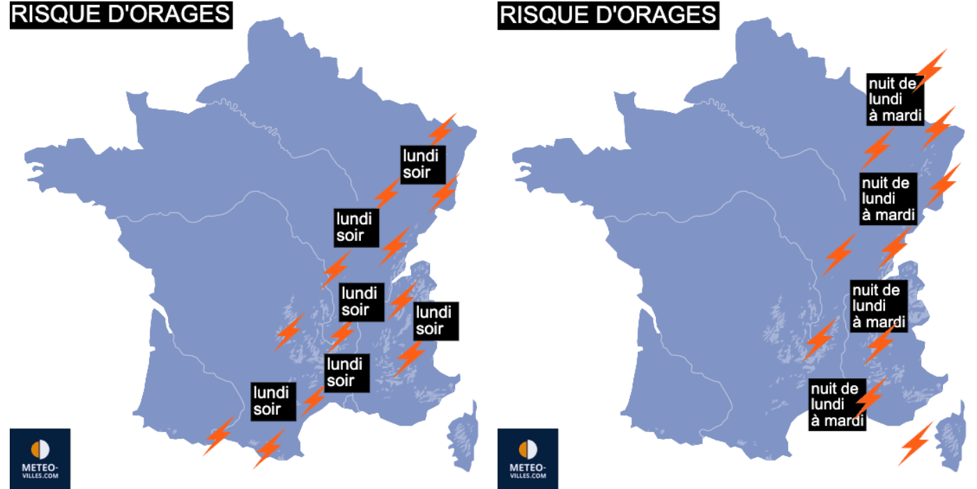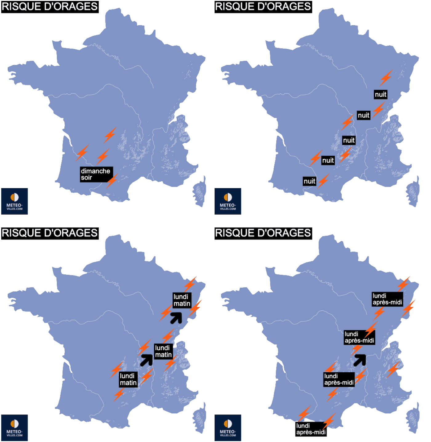 Le risque orageux s’étendra ensuite vers la Bourgogne ainsi qu'à la Franche-Comté, aux Vosges et même le sud de l’Alsace dans la matinée de lundi.