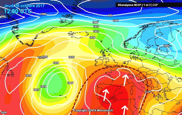 Situation du jeudi 26 octobre 2017 avec la remontée d'air chaud sur la France - via meteociel.fr