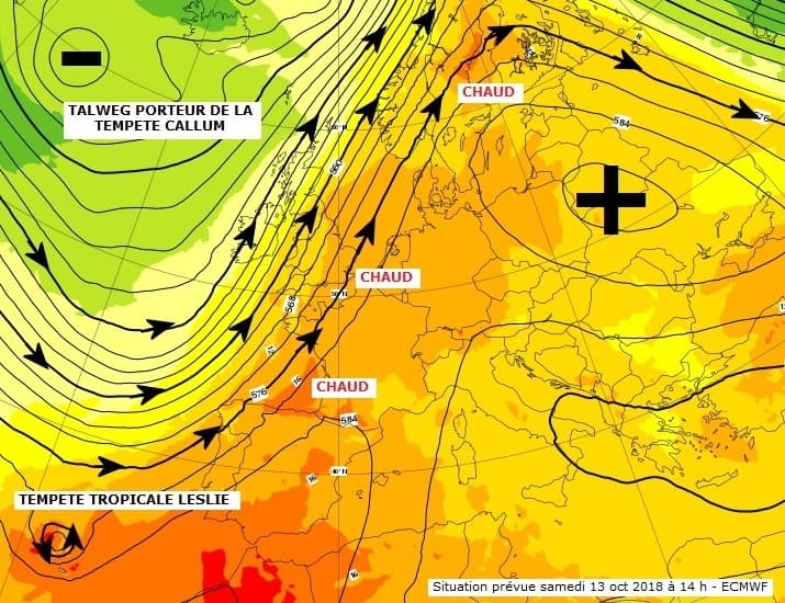 Situation du samedi 13 octobre 2018 avec la remontée d'air chaud sur la France - ECMWF