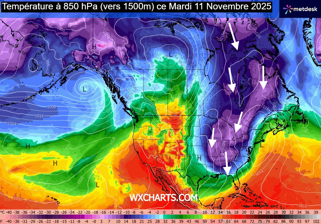 De l'autre côté de l'Atlantique, l'hiver ne s'est pas fait attendre ! Une coulée d'air polaire massive et précoce a envahi toute la partie est du continent nord-américain depuis ce week-end ! Cet air polaire plonge très au sud, atteignant les côtes du golfe du Mexique et le nord de la Floride ! En altitude vers 1500m, les températures atteignent -10 à -14°C jusque dans le sud-est des USA, des niveaux se situant 15 à 20°C en dessous des moyennes saisonnières !