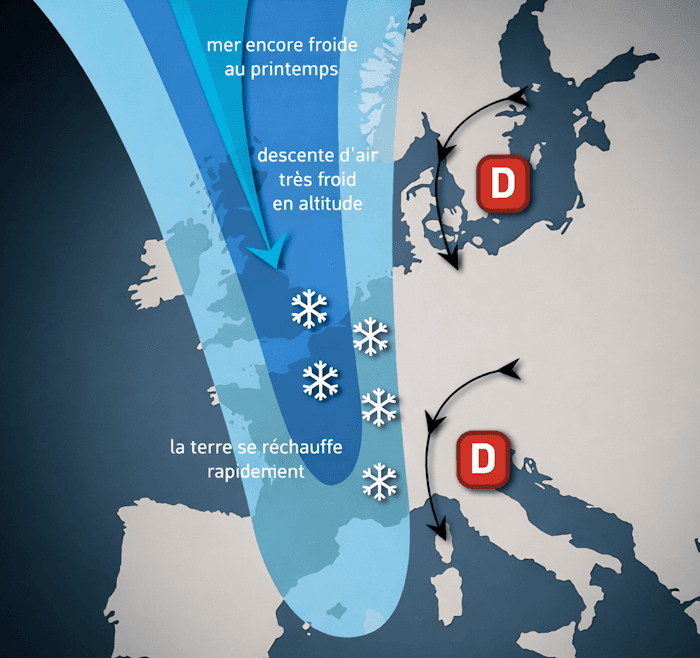 Schéma d'une coulée d'air froid propice aux giboulées lors du printemps - Météo Villes, livre Y'a plus de saison !