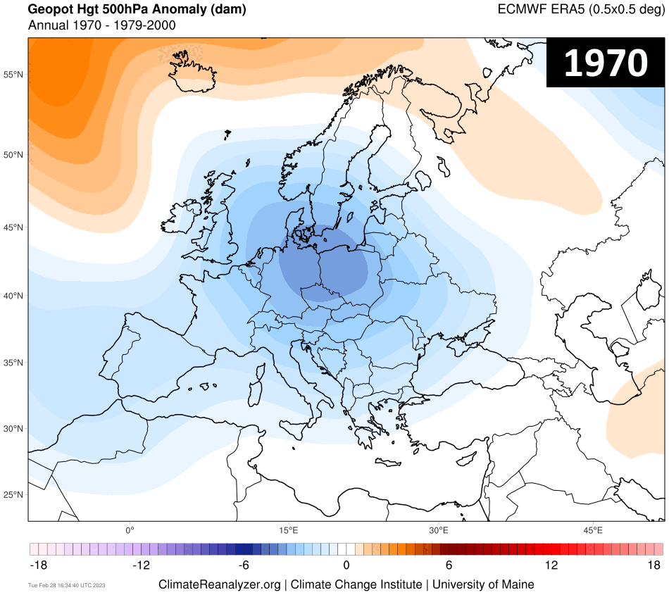 Anomalies annuelles de géopotentiels en Europe de 1970 à 2022 - via climatereanalyzer.org