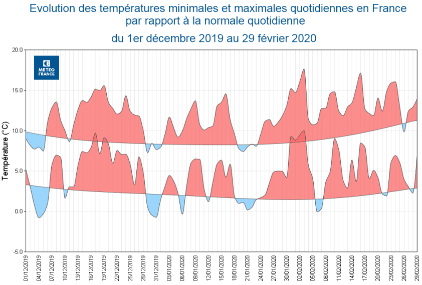 Si cette période de douceur inédite a été précédée et suivie de températures plus hivernales, nous avons assisté lors de l'hiver 2019-2020 à la première saison hivernale quasi-inexistante ! Du 1er décembre 2019 au 29 février 2020, l'anomalie thermique nationale fut de +2,7°C ! En regardant le graphique ci-dessous, on constate qu'aucun épisode de froid n'était survenu durant les trois mois de l'hiver, dominés outrageusement par les anomalies douces. Un "non-hiver" encore impensable quelques années plus tôt...
