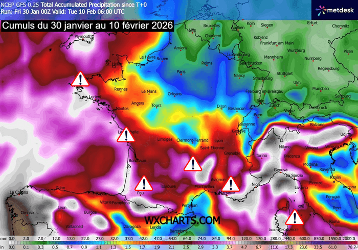 Cumuls de précipitations envisagés jusqu'au 10 février 2026 – Modèle GFS via WX CHARTS