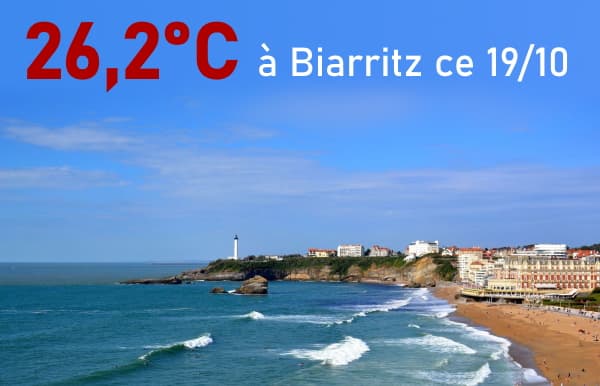 Au pied des Pyrénées, cette configuration est très favorable à l'effet de foehn, un assèchement et un réchauffement important de la masse d'air lorsque les vents violents soufflent sur le relief pyrénéen et qui se manifeste sur le piémont. C'est ainsi que la température maximale a atteint 26,2°C à Biarritz ce lundi 19 octobre 2020.