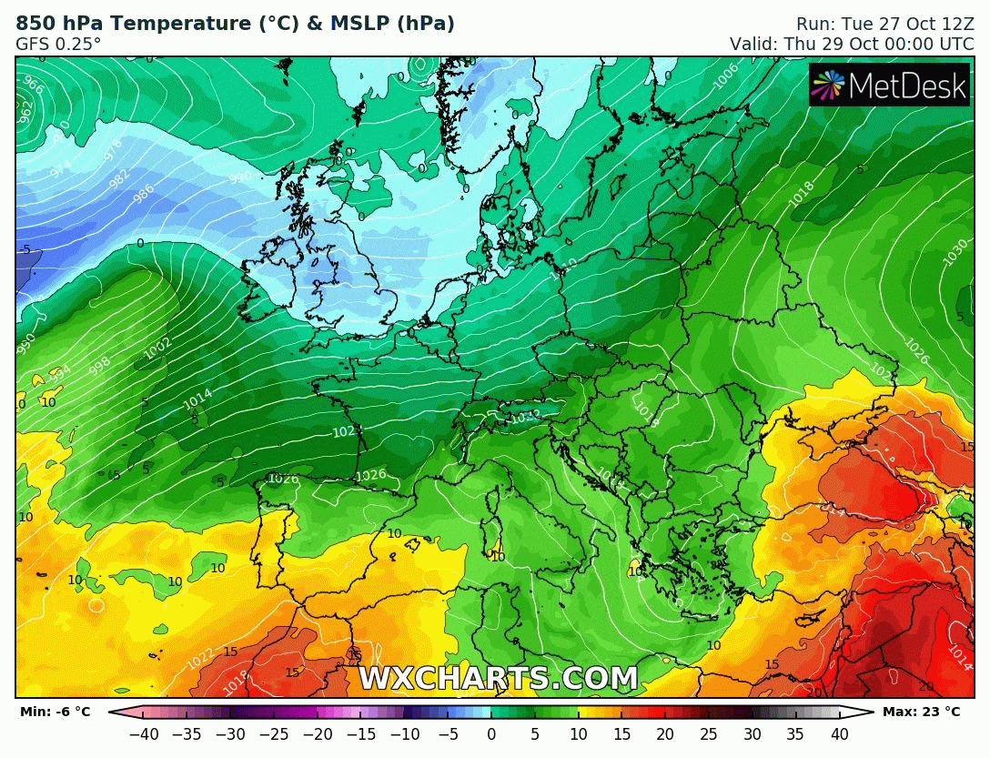 Alors qu'une vaste zone de basses pressions va rester positionnée sur l'Atlantique-nord, l'anticyclone des Açores va étendre une dorsale en direction de la France dès la journée du jeudi 29 octobre. L'anticyclone viendra ensuite se centrer sur l'est de notre pays et la Suisse entre vendredi et samedi, s'étendant jusqu'à l'est du continent et à l'ouest de la Russie d'ici le dimanche de la Toussaint.