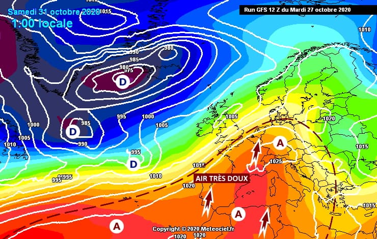 Comme le montre l'animation de la masse d'air ci-dessus, l'air très doux (matérialisé en jaune-orangé) va notamment gagner la France à compter du vendredi 30 octobre. Il englobera la quasi-totalité du territoire durant le week-end de la Toussaint et jusqu'en journée du lundi 1er novembre 2020. On constate toutefois un retour de l'air frais par l'ouest dès le mardi 2.