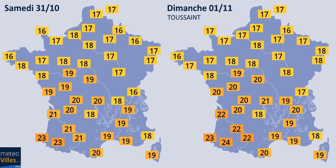 Pour le dimanche de la Toussaint, la douceur sera au moins aussi sensible que la veille. Les températures maximales afficheront souvent 17 à 18°C sur les régions du nord, autour de 19 à 20°C dans le centre de la France (21°C à Clermont-Ferrand) et jusque 22 à 24°C au sud de la Garonne où un ressenti printanier est attendu !