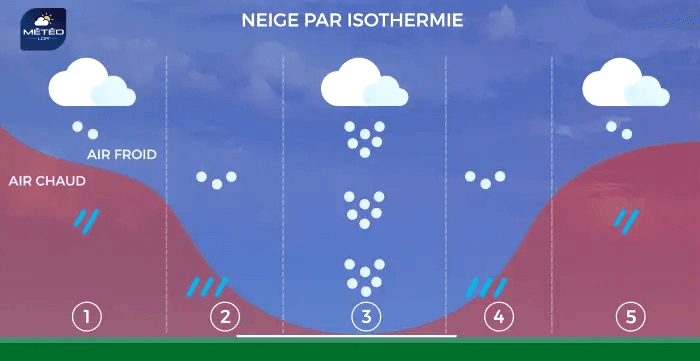 Dans ce type de situation, l'effet d'isothermie peut constituer un casse-tête. Lorsque les précipitations sont suffisamment soutenues et persistantes, elles entraînent avec elles une partie de l'air froid d'altitude en direction du sol, faisant baisser la température et conduisant à changer la pluie en neige à des altitudes de plus en plus basses. Plus les intensités sont fortes et plus la neige peut atteindre les basses altitudes, parfois jusqu'en plaine. Toutefois, ces situations sont délicates à prévoir car il suffit de précipitations un peu moins actives que prévu pour que la neige reste cantonnée plus haut en montagne.