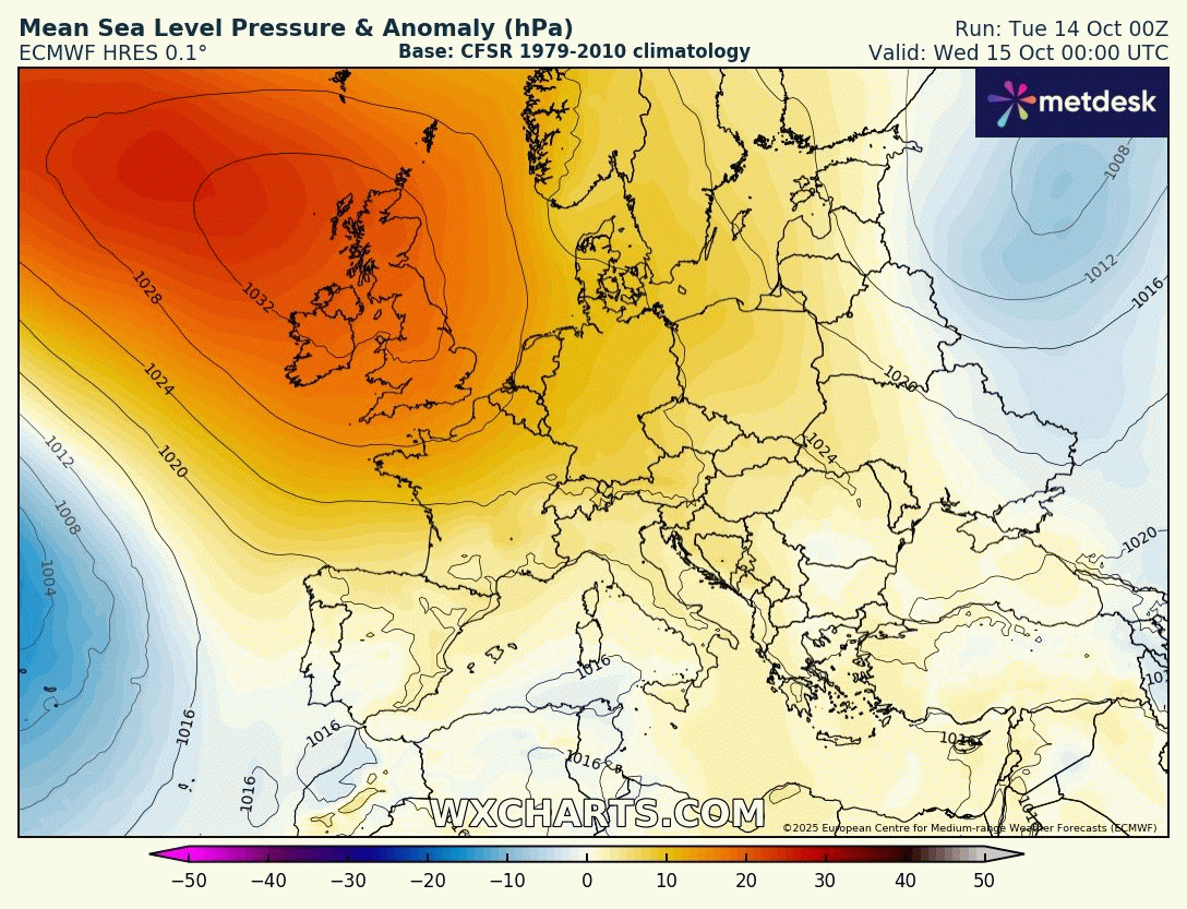 Anomalie de pression du mercredi 15 au lundi 20 octobre 2025 - wxcharts.com