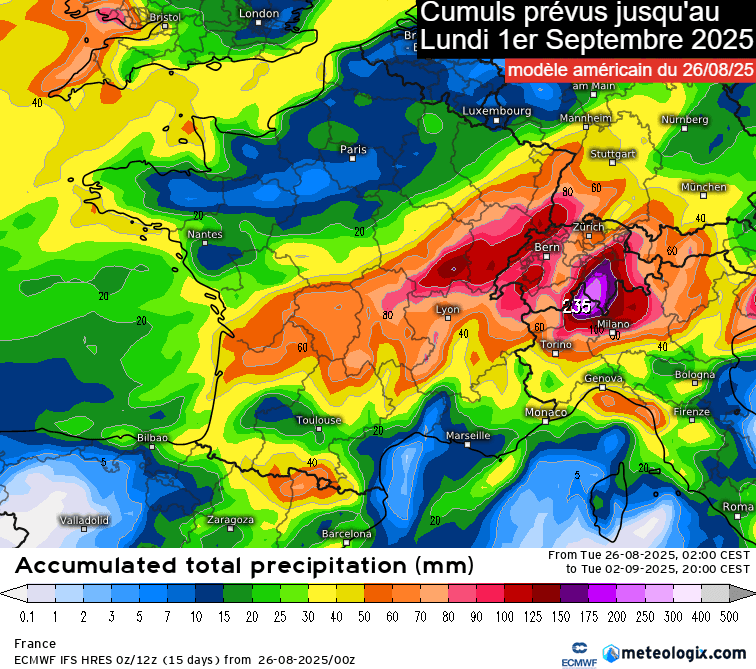 Cumuls de pluie prévus jusqu'au lundi 1er septembre 2025 selon le modèle européen - meteologix.com