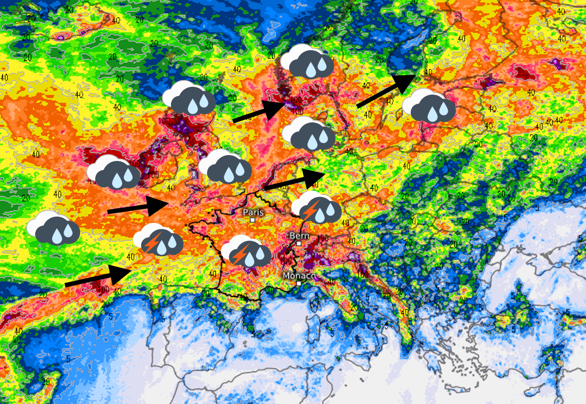 Ainsi, les 7 jours à venir seront rythmés par les orages et les pluies avec des accumulations qui vont devenir conséquentes. C'est notamment le cas du nord de l'Aquitaine aux frontières de l'est où le modèle américain envisage des cumuls fréquemment comprises entre 60 et 100 mm et pouvant même atteindre 100 à 150 mm du sud de la Bourgogne au sud de l'Alsace ! On attend aussi un arrosage copieux sur toutes les régions bordant la Manche, l'Atlantique et les Pyrénées.
