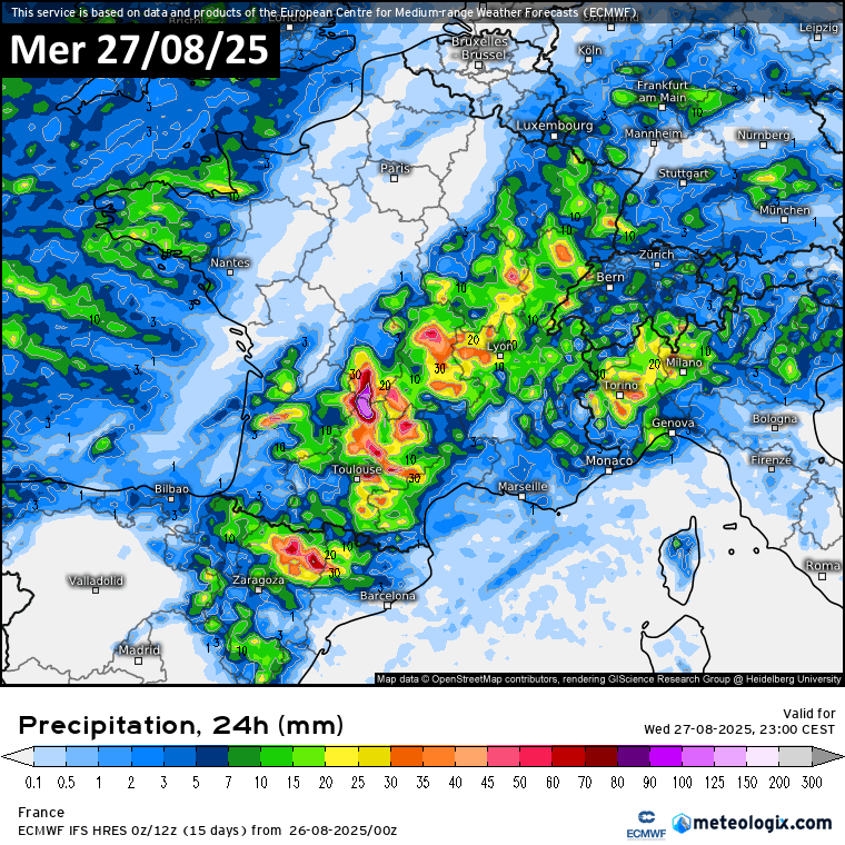Cumuls de pluie sur 24h du mercredi 27 août au lundi 1er septembre 2025 - meteologix.com