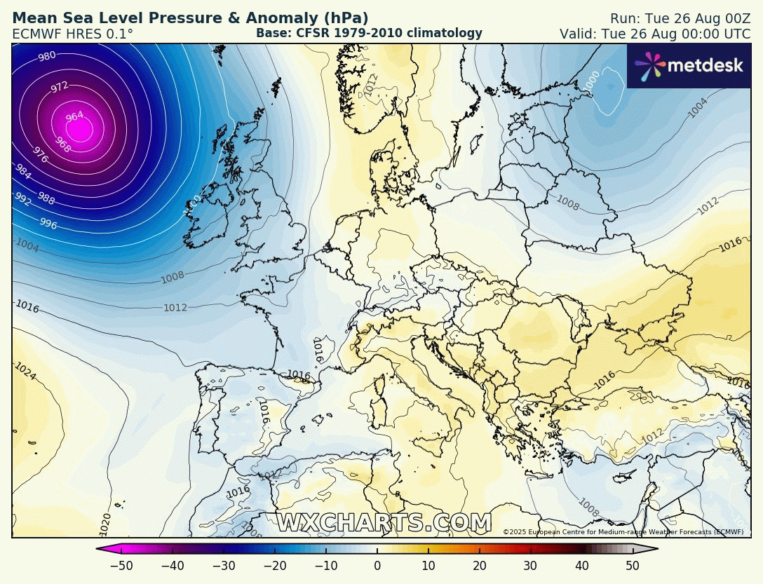 Anomalie de pression du mardi 26 août au lundi 1er septembre 2025 - wxcharts.com