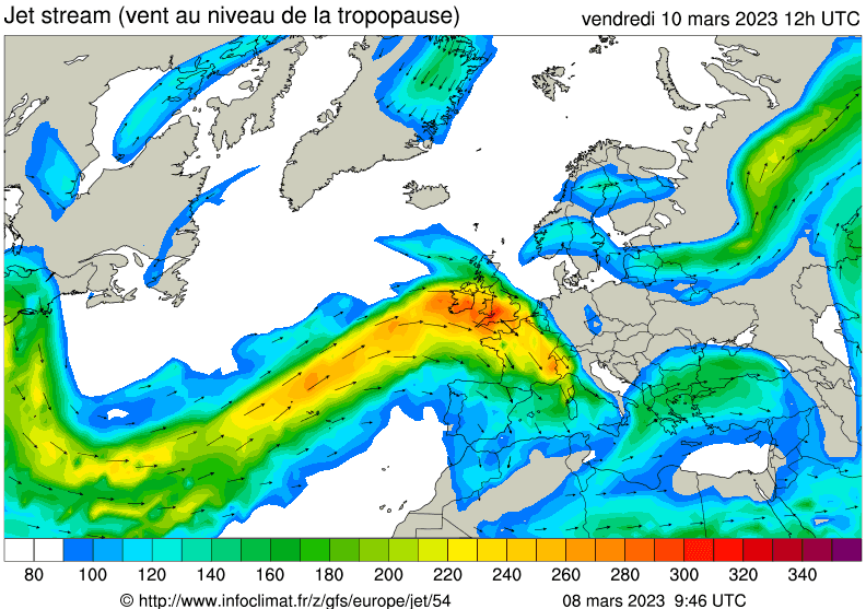Prévision du jet stream (vent en haute altitude) pour le vendredi 10 mars 2023 - via infoclimat.fr