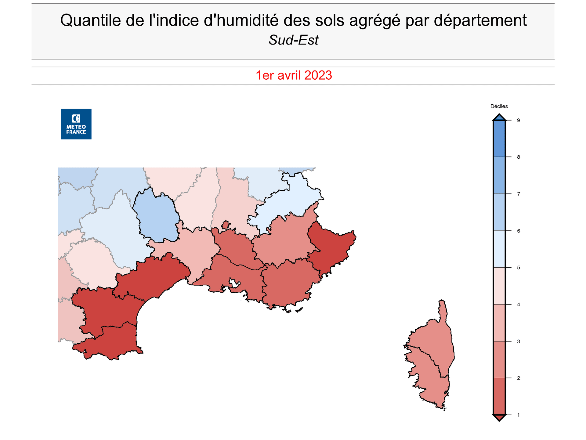 Rapport à la normale de l'indice d'humidité des sols au sud-est au 1er avril 2023 - via Météo France