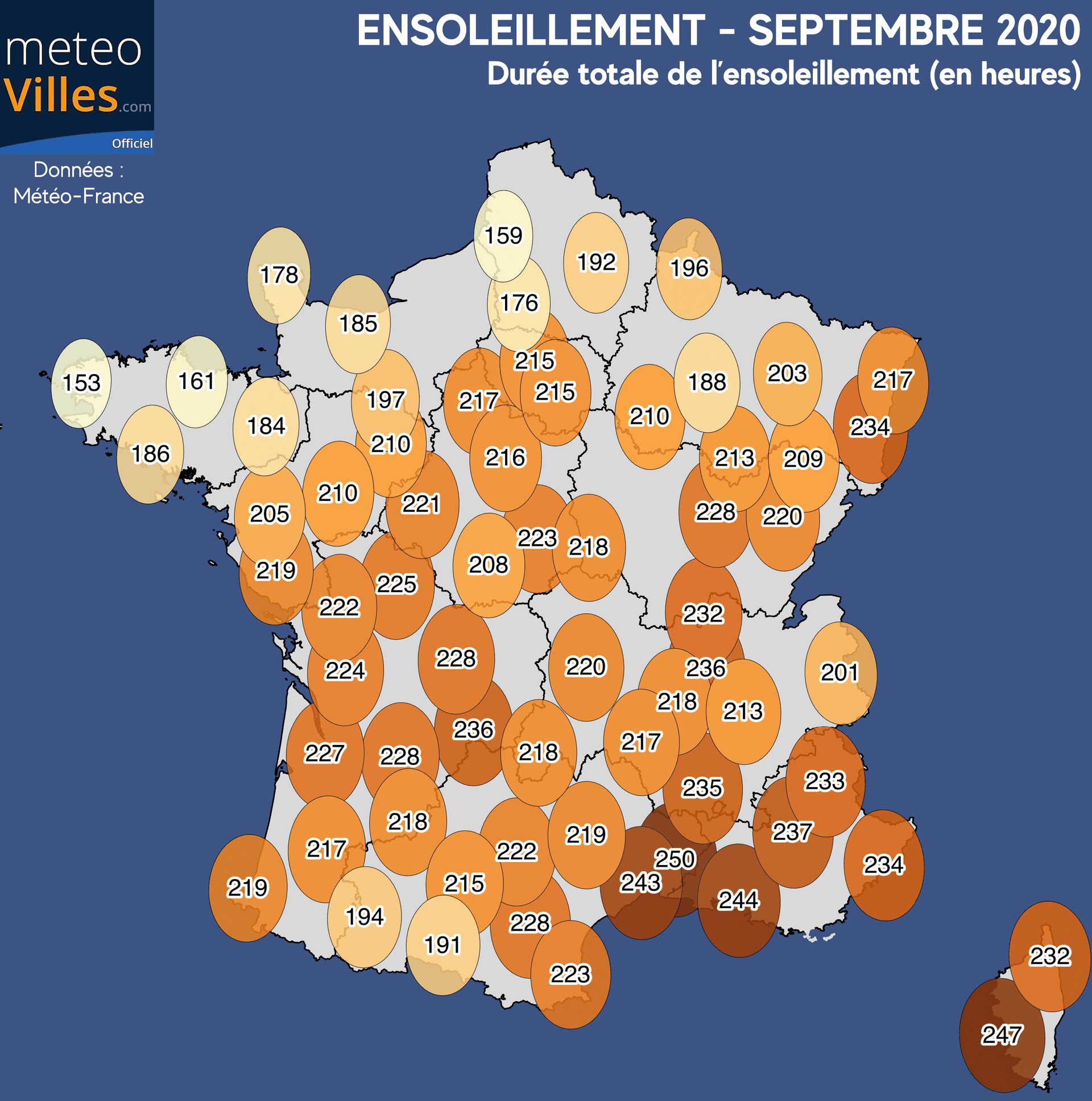 Comme à chaque début de mois, nous vous proposons un bilan climatologique du mois écoulé. Place donc au bilan cartographié du mois de SEPTEMBRE 2020 en terme de température, pluviométrie et ensoleillement sur un panel de 73 stations*.