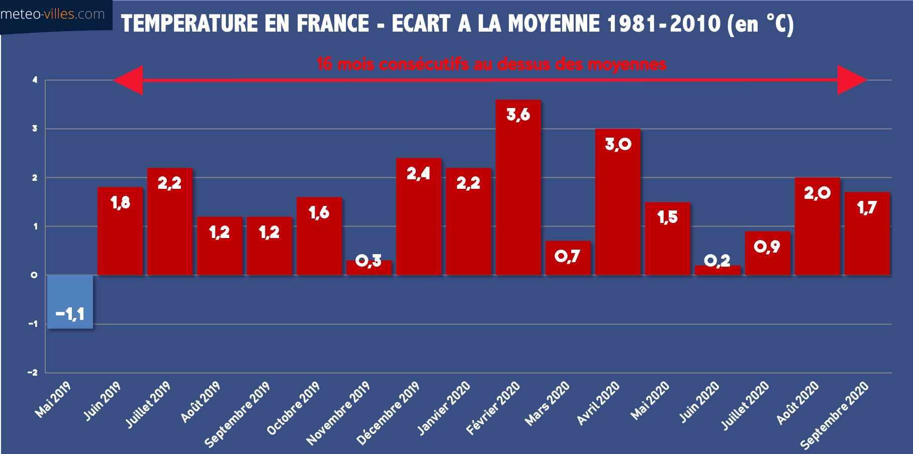 Depuis plusieurs mois, les températures sont sans cesse au-dessus des moyennes de saison à l’échelle nationale, et ce mois de septembre 2020 n’a pas dérogé à la règle. En effet, avec une anomalie positive de +1.7°C, il s’agit du 16e mois consécutif au-dessus des moyennes, du jamais vu depuis le début des observations météo en France (le dernier mois « frais » remonte à mai 2019 avec -1.1°C d’anomalie).