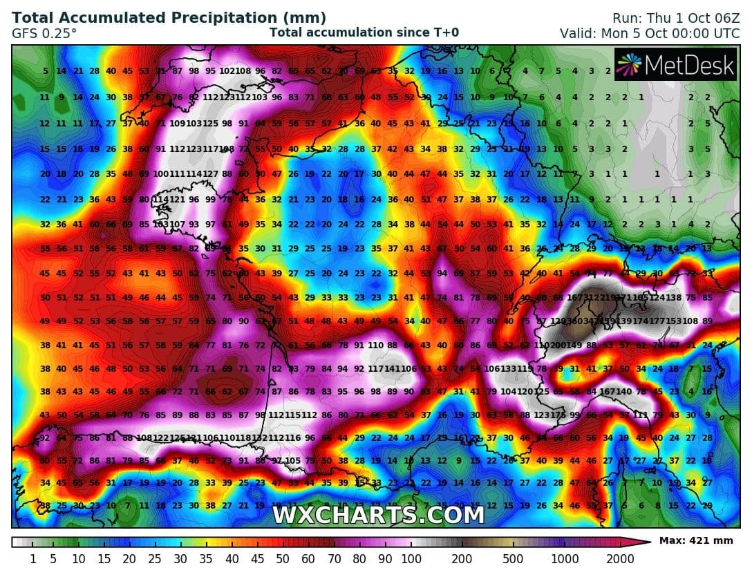 Modélisation des cumuls totaux de précipitations d'ici le dimanche 4 octobre 2020 au soir - via wxcharts.com