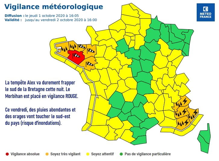 Carte de vigilance émise le jeudi 1er Octobre à 16h00 - Météo-France