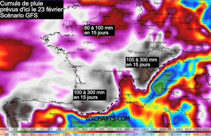 Cumuls de pluie prévus d'ici le 23 février selon le scénario GFS