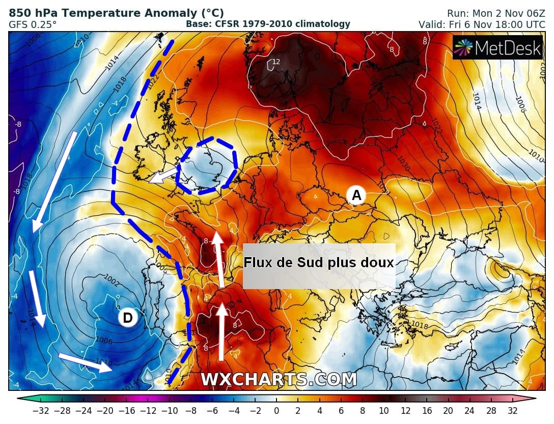 Anomalies de températures à 850hPa et isobares sur l'Ouest de l'Europe le Jeudi 5 Novembre - Modèle GFS via WX CHARTS