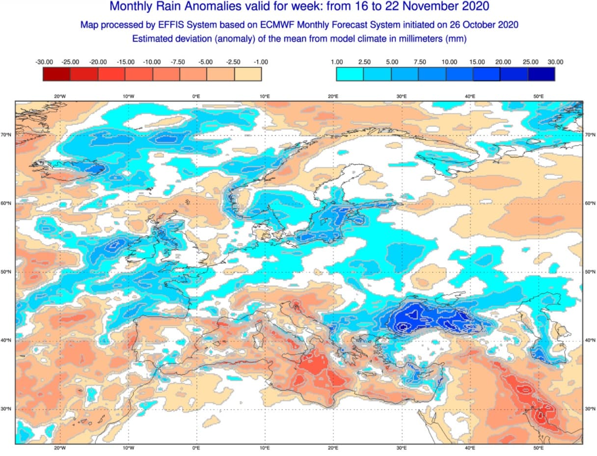 Anomalies de précipitations sur l'Ouest de l'Europe durant la semaine du 16 au 22 Novembre - Modèle ECMWF via EFFIS