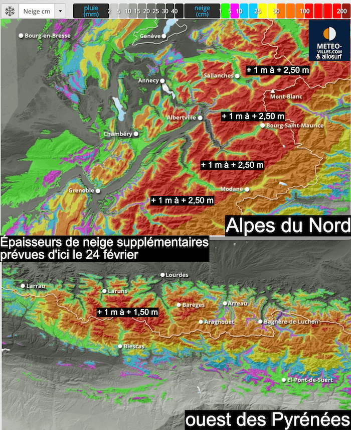 D'autres chutes de neige abondantes sont prévues d'ici la fin du mois (et notamment d'ici le 24 février) à tel point qu'il pourrait encore tomber 1 m à 2,50 m supplémentaires en haut des pistes, notamment sur le nord des Alpes et l'Ouest des Pyrénées ! Les épaisseurs pourraient ainsi atteindre localement 5 m voire davantage...
