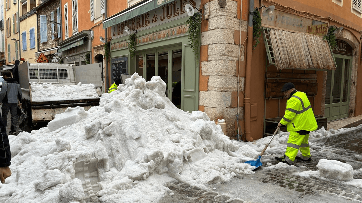 Importants amas de grêle dans les rues d'Antibes après l'orage ce mercredi 4 février 2026 - photo Véronique Varin FTV