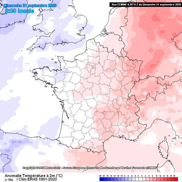 Prévisions des anomalies de température à 2 m du sol jusqu'à vendredi 26 septembre - modèle Météo européen - site METEOCIEL