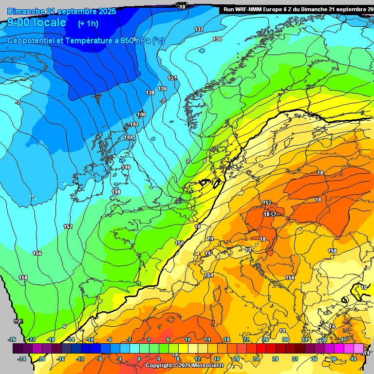 Évolution de la température de la masse d'air à 850 hPa jusqu'à vendredi 26 septembre - modèle Météo WRF - site METEOCIEL