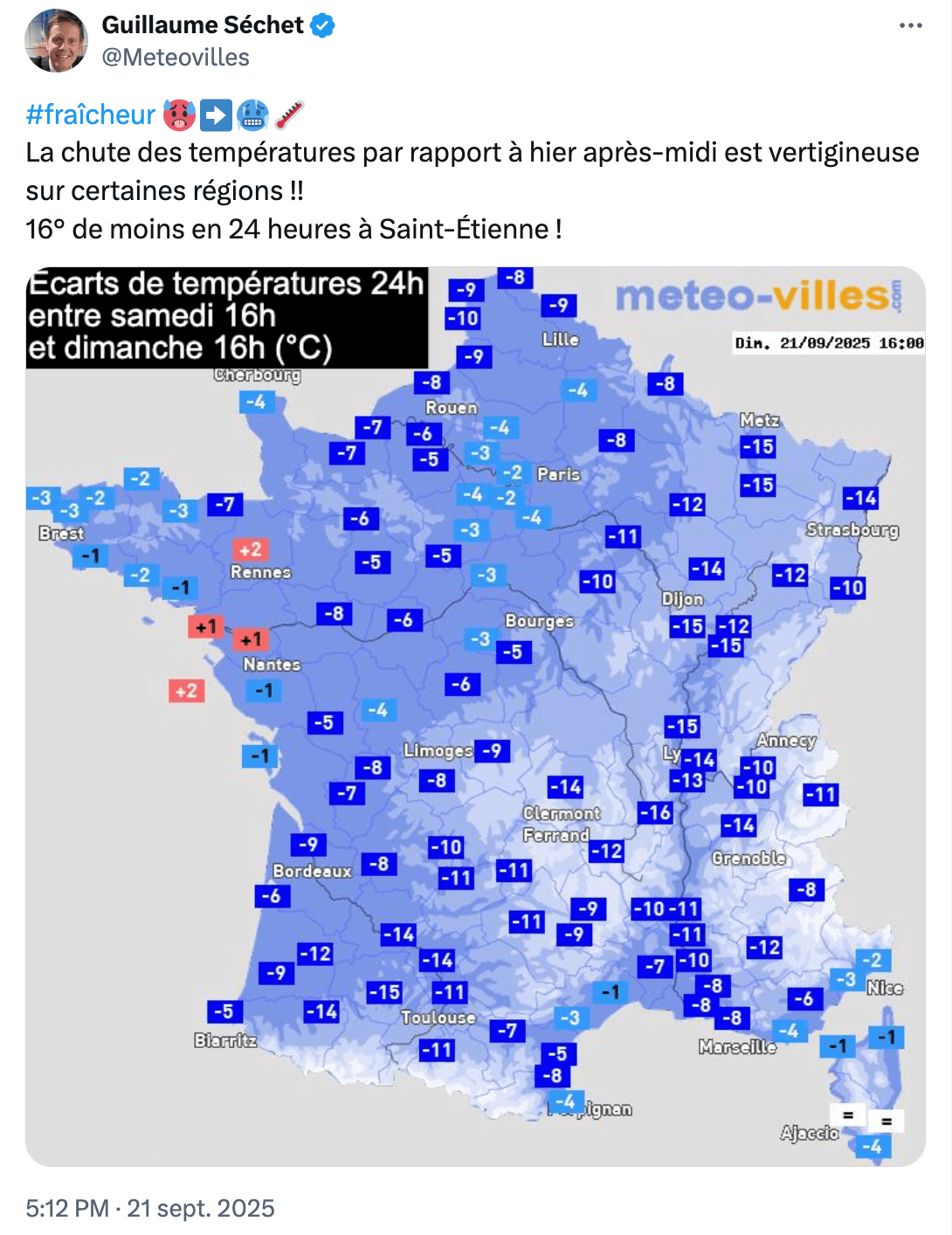 Les températures maximales prévues ce dimanche 21 septembre (valables jusqu'au samedi 27) seront généralement inférieures à 20°C, et même comprises entre 11 et 15°C du Nord-est au Massif-central jusqu'en fin de semaine… Certaines villes des régions méditerranéennes seront également concernées par cette fraîcheur.