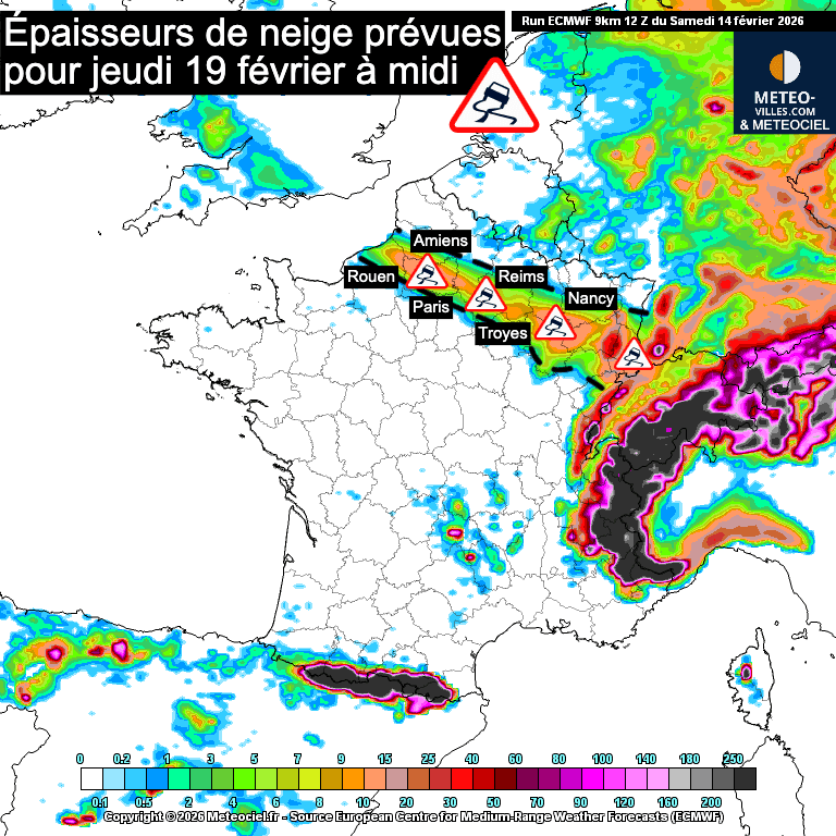 Épaisseurs de neige maximales prévue pour le jeudi 19 février 2026 – Météo-Villes