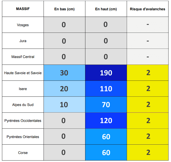 Enneigement moyen par massif en date du jeudi 18 décembre 2025 - Météo Villes