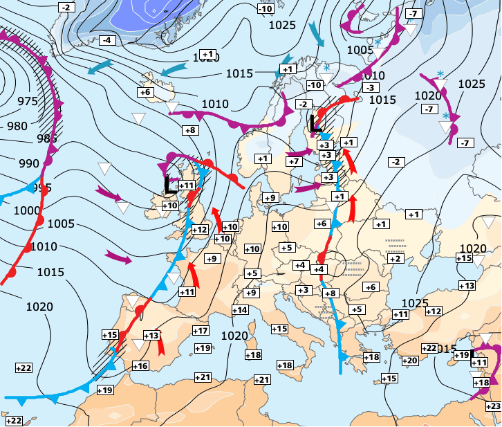 + Pour le moment l’anticyclone d'Europe continentale tient bon et le courant perturbé océanique ne fait qu'effleurer les régions de l’Ouest (passage d’un petit front pluvieux dans la nuit de mercredi à jeudi).