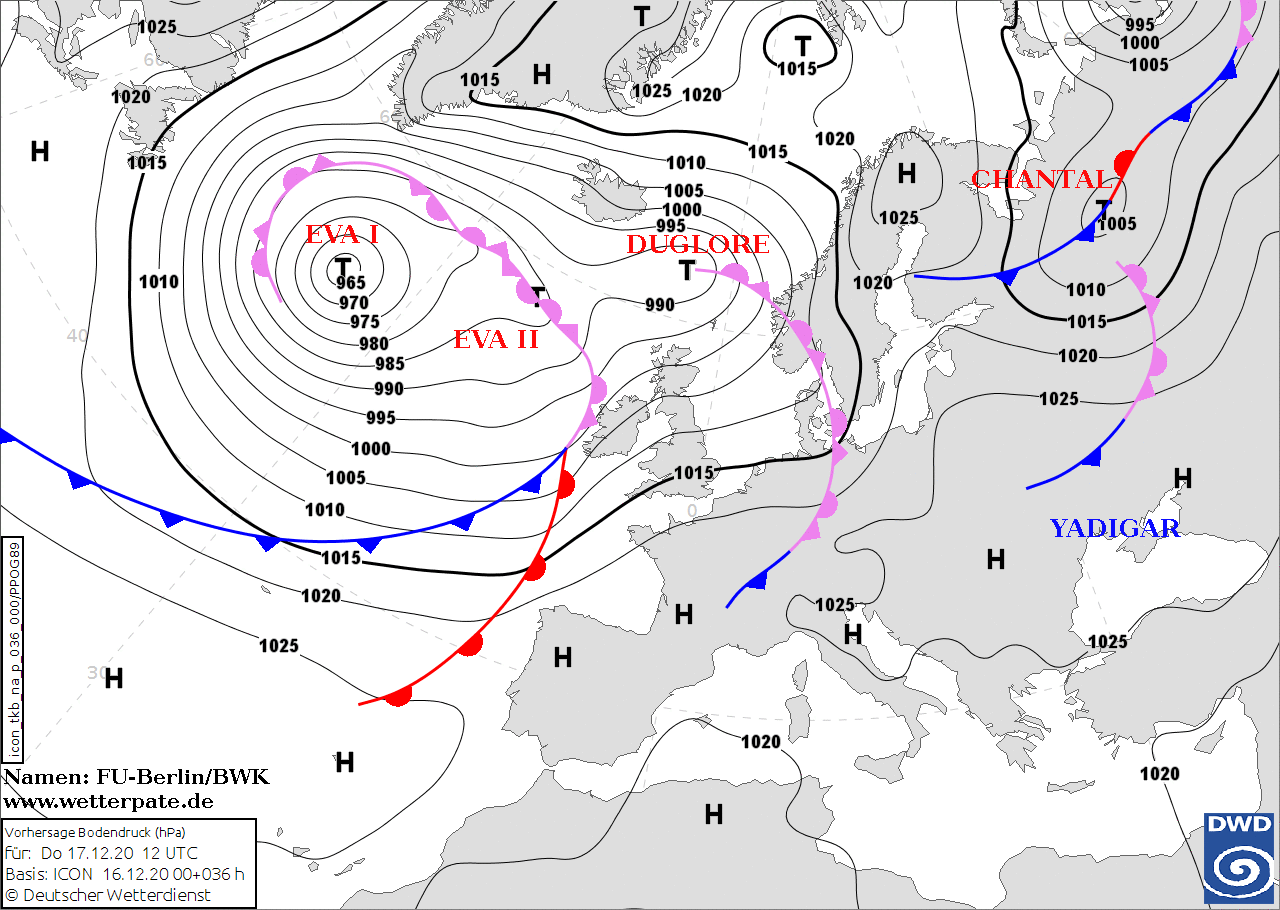 Noms des dépressions et anticyclones prévus pour jeudi 17 décembre 2020 à midi (Berlin)
