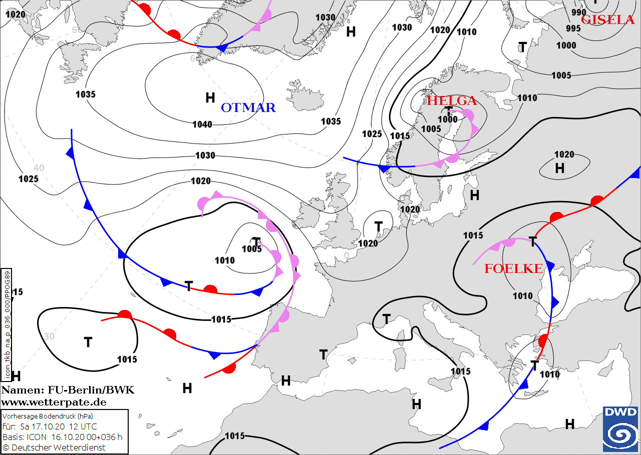 Noms des dépressions et anticyclones prévus pour dimanche 18 octobre 2020 à midi (Berlin)