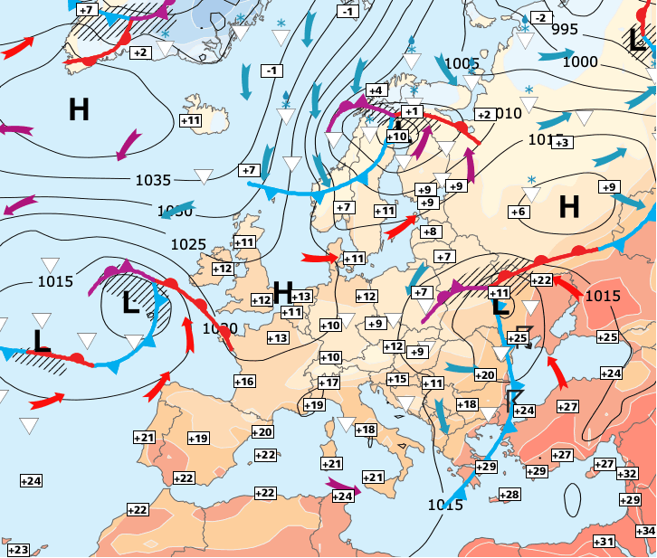 + Lundi : le centre de l’anticyclone se décalera vers l’Europe de l'Est, et la France sera progressivement influencée par un flux de Sud beaucoup plus doux et temporairement plus sec qui chassera la grisaille vers le nord.